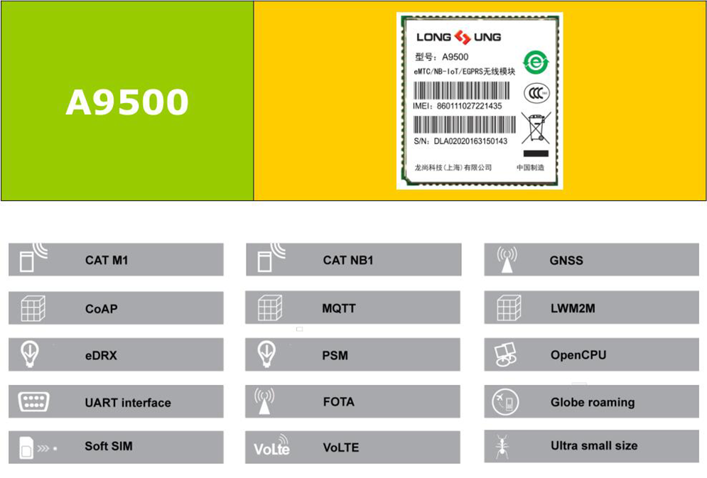 Longsung A9500 is one of the smallest LPWAN modules in LCC castellation packaging with the compact