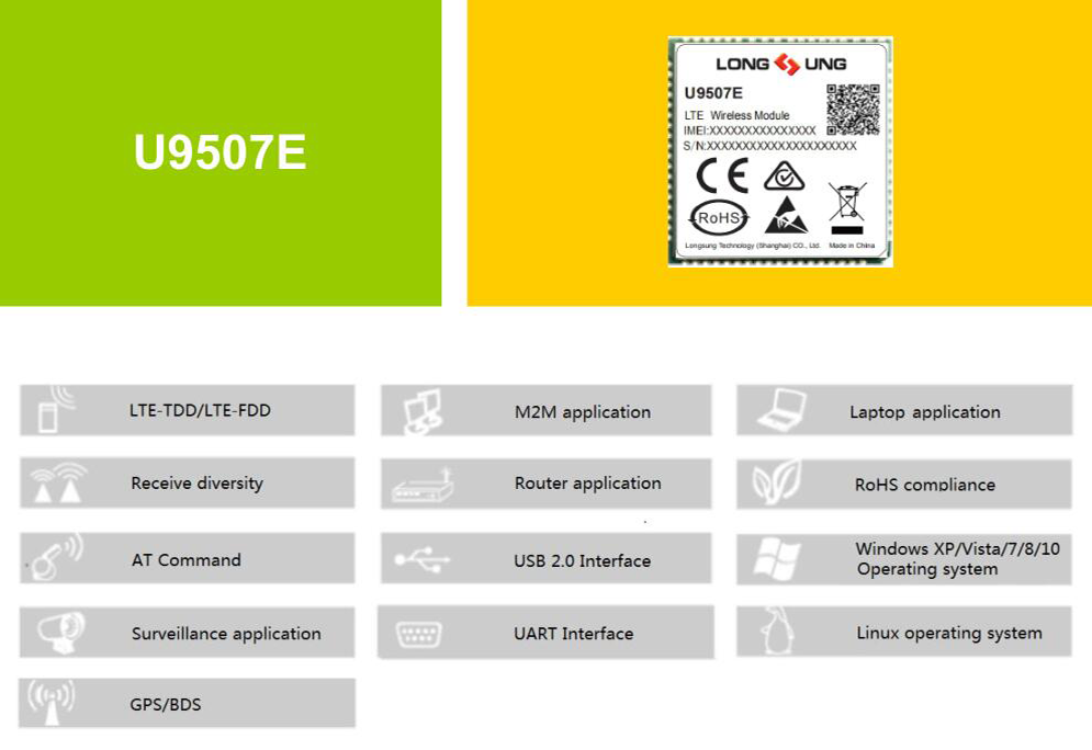 U9507E is a new generation of Longsung LTE wireless module, rich of Internet protocols, and standard interfaces and abundant functionalities.It can be designed in many kinds of applications which can work on LTE-FDD/LTE-TDD/UMTS/GSM/GPS/ GLONASS(Optional) network.